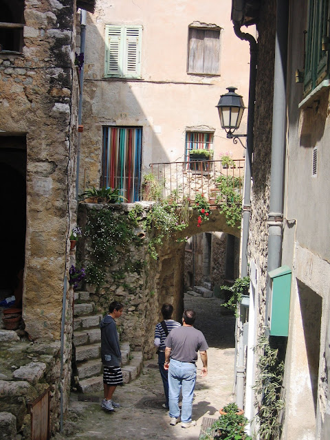 Below: walking down from the chateau at the top of the village. Love the plastic cafe-type strips in the doorway. Reminds me of Australia in the 1960s!